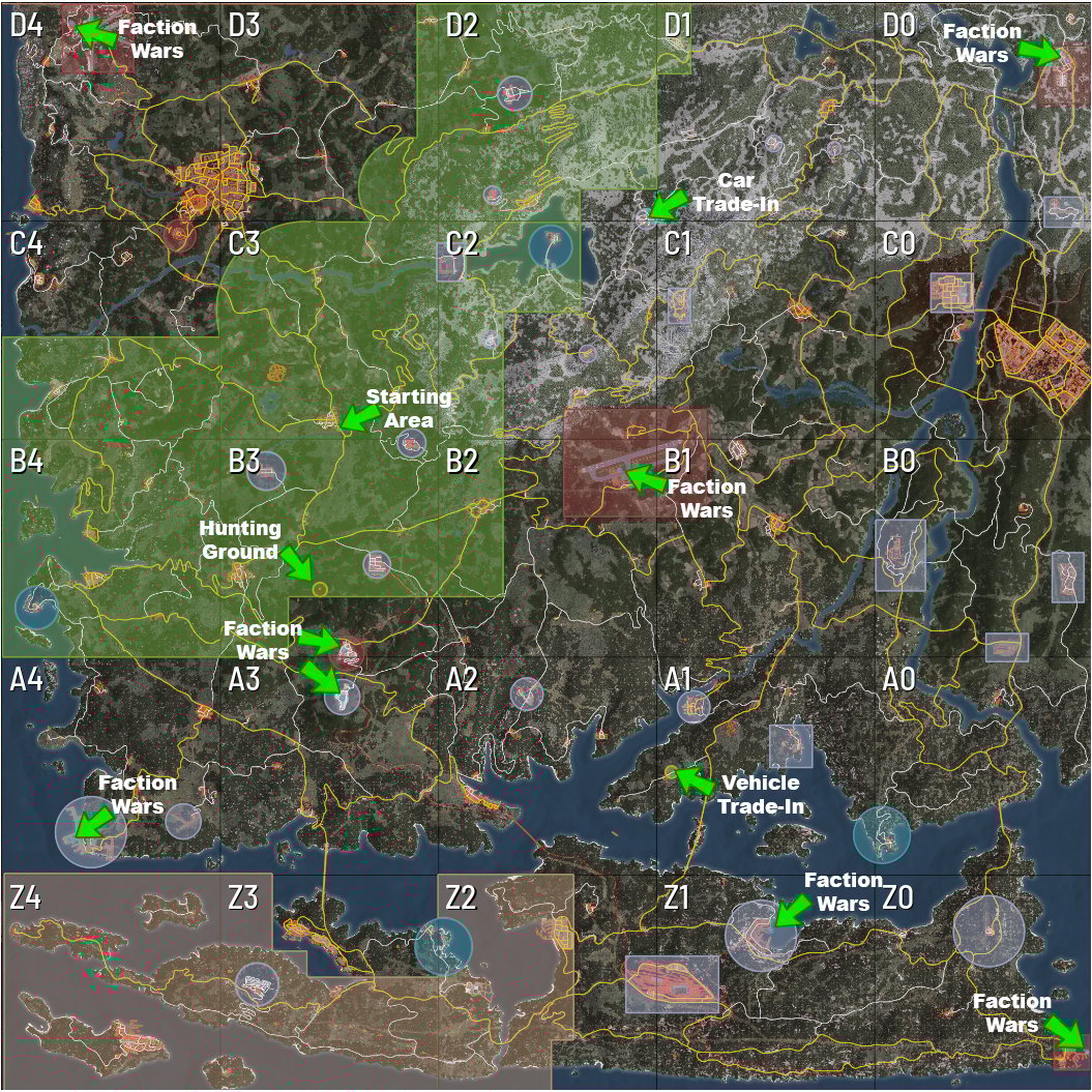 Wir haben 7 abwechselnde Warzones, die rund um die Uhr aktiv sind: Airport D4, Airfield B2, Military Baracks D0 und A1. Hier könnt ihr alle 5 Minuten ein Waffenpaket finden. Der einzige Ort, wo unter anderem eine RPG7 und eine Menge Explosives spawnen können. Auch die Schlüssel-Items sind hier zu finden.